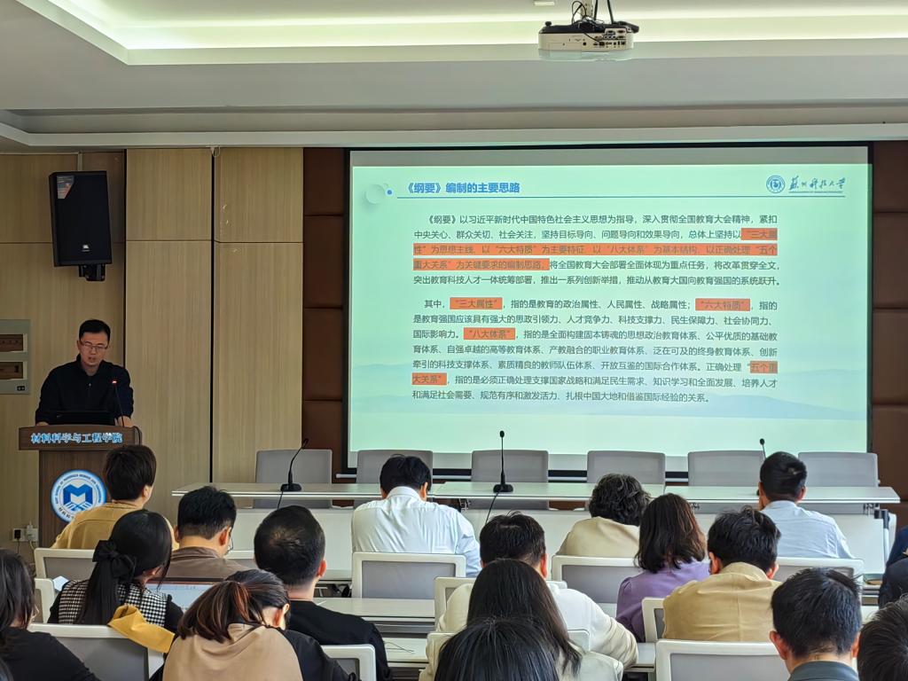 教务办副主任兰凯从《纲要》出台的背景和意义、《纲要》编制的主要思路、《纲要》的总体目标设定、《纲要》的结构和主要内容以及如何抓好《纲要》贯彻落实等方面领学了《教育强国建设规划纲要(2024—2035年)》。