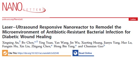 近日,公司3044永利生化传感团队在材料科学国际权威期刊《Nano Letters》(Nature Index期刊)发表糖尿病疾病治疗领域最新研究成果,论文题目为《Laser−Ultrasound Responsive Nanoreactor to Remodel the Microenvironment of Antibiotic-Resistant Bacterial Infection for Diabetic Wound Healing》。公司硕士研究生安星星为第一作者,陈博副教授、杨鸿斌教授、郭春显教授为共同通讯作者。公司为第一完成单位。