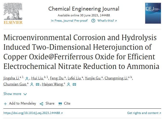 近日,公司电催化团队在材料、化学工程领域知名期刊《Chemical Engineering Journal》 (IF: 16.744) 上发表研究论文,题目为 “Microenvironmental Corrosion and Hydrolysis Induced Two-Dimensional Heterojunction of Copper Oxide@Ferriferrous Oxide for Efficient Electrochemical Nitrate Reduction to Ammonia”。公司为第一署名单位,青年教师李静莎博士为第一兼通讯作者,郭春显教授为通讯作者。