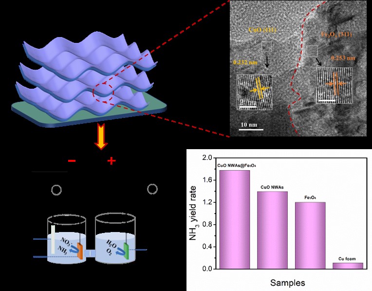 该工作设计和构筑了一种由微环境腐蚀和水解诱导生成的二维异质结催化剂,组分为CuO纳米阵列复合Fe3O4材料(CuO NWAs@Fe3O4)。在电催化硝酸根还原制氨应用上,该催化剂实现了在碱性电解质中95.93%的硝酸盐转化率,在−0.27 V vs. RHE下展现了97.46%的法拉第效率。值得强调的是,其高催化活性可以使硝酸盐转化为氨的转化率达到88.68%以上。本研究为设计和开发兼具高活性和高选择性的硝酸根还原制氨电催化剂提供了一种新的思路。
