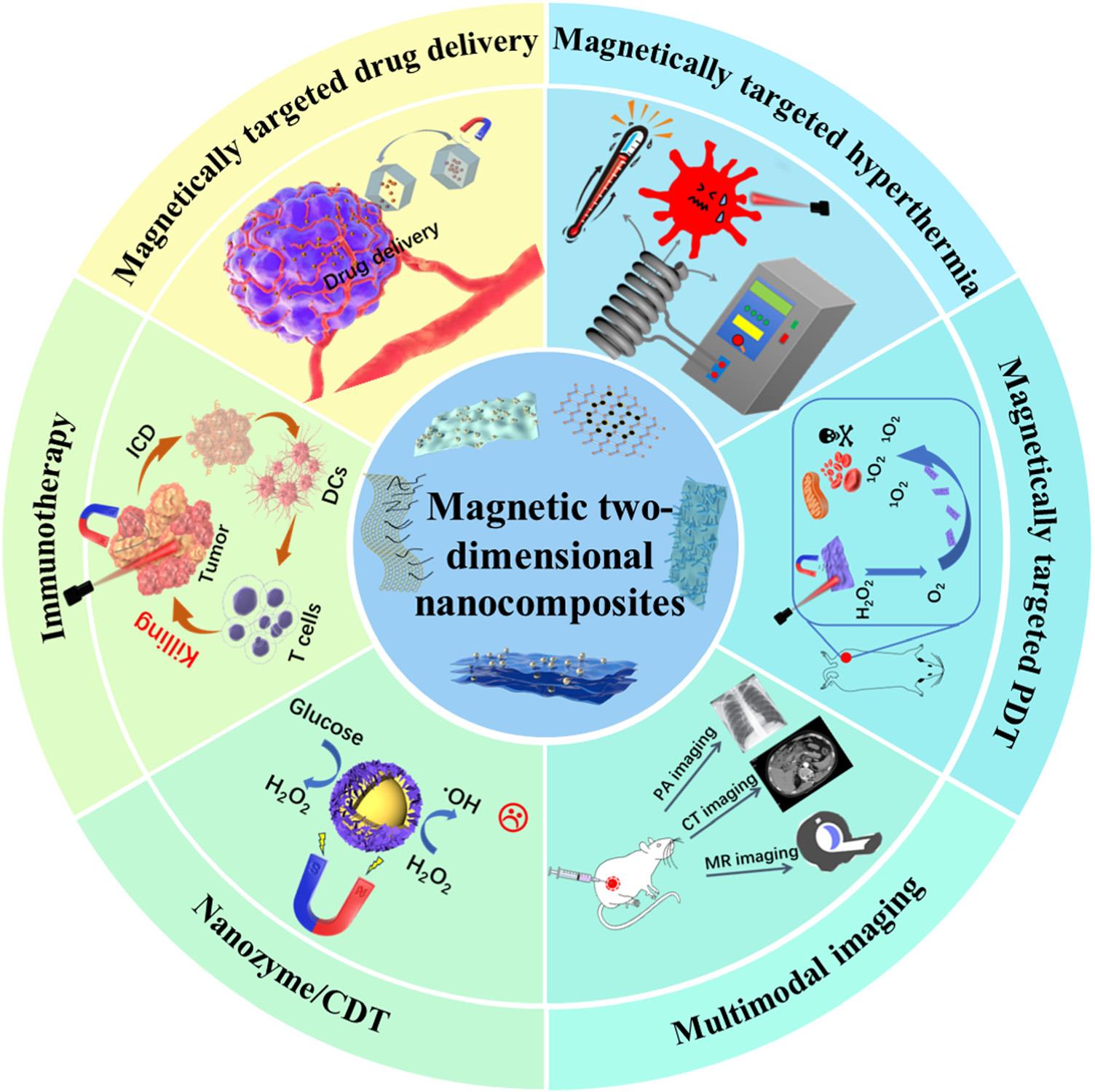 磁性二维纳米复合材料(M2D NCs)协同整合了磁性纳米材料与二维纳米材料的结构与性能优势,逐渐在多模态抗肿瘤治疗领域中得到重视与应用。课题组基于对M2D NCs的研究积累,对近期M2D NCs在抗肿瘤中的应用进行了综述。本综述介绍了M2D NCs的设计策略、制备方法及磁光响应特性,并基于二维材料的结构分类详述了不同类型的M2D NCs及在多模态肿瘤诊疗中的应用,包括在磁靶向药物递送、磁热疗、磁靶向光动力、纳米酶、免疫治疗、多模成像中的新进展。最后,本综述提出了M2D NCs面临的挑战并展望了其在临床发展上的机遇,包括利用AI技术进行材料的精准定制,基于对肿瘤发展与转移机制的深入了解实现高效设计,以及临床磁光诊疗设备与技术推广带来的应用便利。