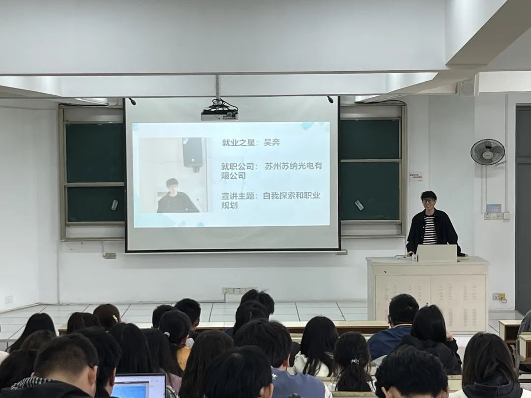 成功与苏州苏纳光电有限公司签订就业协议的吴奔同学以“自我探索和职业规划”为主题,指出同学们要对自身的职业生涯做出持续性、系统化的计划,对自己进行全面分析,明确自身的长处和不足,扬长避短,找到自己的定位,明晰自己更擅长哪一种岗位。