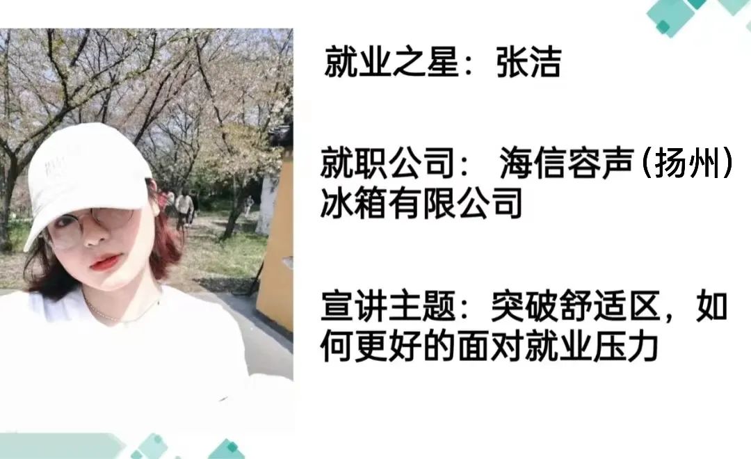 因事未能到达现场的张洁同学在线上分享她的经验——“突破舒适区,如何更好地面对就业压力”。她表示,当习惯了固有的行为模式,思维与行动僵化,处于“温水煮青蛙”的状态时,大家就需要调整自己的思维模式和行为方式,去迎接新的挑战,并强调如果缺失了突破舒适区的勇气与能力,就会错失进步的机会。