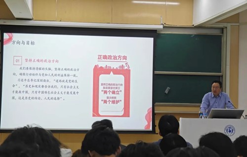 施亚东从理想信念的含义和重要性为切入点进行阐述,通过讲述中国革命四个历史阶段取得的伟大成就阐述了“革命理想高于天”的深刻意义,让同学们深刻感受到信仰的强大力量。他强调中国共产党人始终坚守为人民谋幸福,为民族谋复兴的初心使命,鼓励同学们要将个人理想与党的理想紧密结合,塑造“忠诚、干净、担当”的政治品格,弘扬优秀的中国传统文化,把握国家和世界发展的总趋势,坚定理想信念、厚植爱国情怀,加强品格修养、培养奋斗精神,拓宽视野、增长见识、提升素养,努力成为具有国际视野和创新能力的复合型人才,抓住前所未有的机遇与挑战机会,为中国式现代化建设挺膺担当。