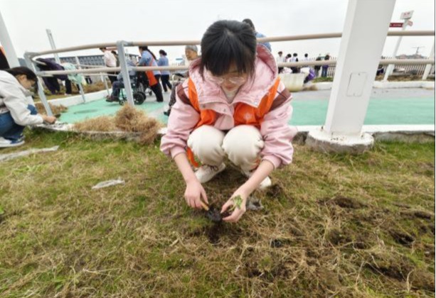 劳作间隙,志愿者们围坐在长辈身边,亲切交流种花的心得经验,分享大学校园趣事,现场气氛融洽。一老一少在劳动与交谈中拉近距离,一老一少在劳动与交谈中拉近距离。