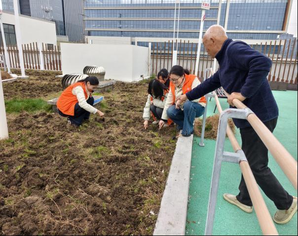 午后的庭院里,身着橙色马甲的志愿者们手持锄头、小铲,与护理经理辈们一同投入劳作。大家分工协作,挥锄翻松板结的泥土,用铲子将土块敲碎整平;蹲身清理杂草枯枝,不放过边角缝隙;栽种环节中,扶苗、培土、压实、浇水,每个步骤有条不紊。经过共同努力,原本沉寂的庭院里,新翻的泥土整齐平整,一排排花苗迎风挺立。