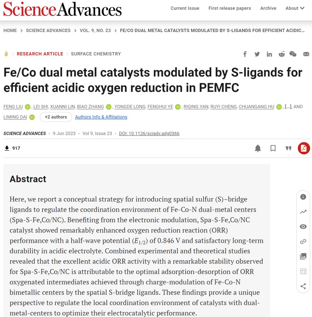 近日,公司3044永利电催化团队青年教师刘峰博士在燃料电池电催化氧还原领域取得新进展,以第一作者身份在Science子刊《Science Advances》(Sci. Adv., 2023, 9, eadg0366)上发表研究论文“Fe/Co dual metal catalysts modulated by S-ligands for efficient acidic oxygen reduction in PEMFC”。