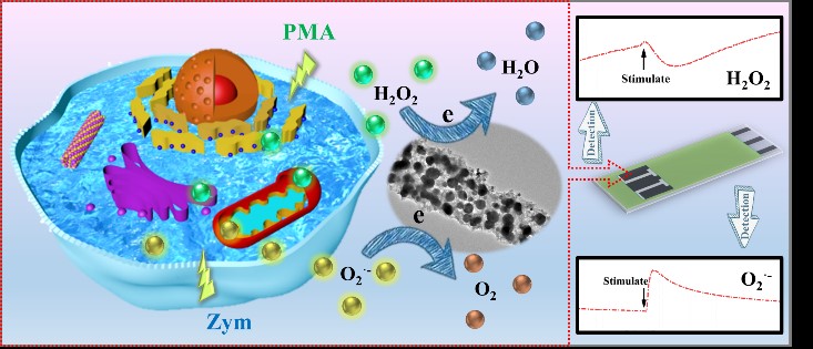 细胞的活动高度依赖于活性氧(ROS)信号分子,其中超氧阴离子(O2•−)和过氧化氢(H2O2)共同调节细胞凋亡和氧化应激等生物学过程,实现O2•−和H2O2的同时鉴定具有重要意义,但在复杂环境下同时检测活细胞释放的O2•−和H2O2仍面临较大挑战。