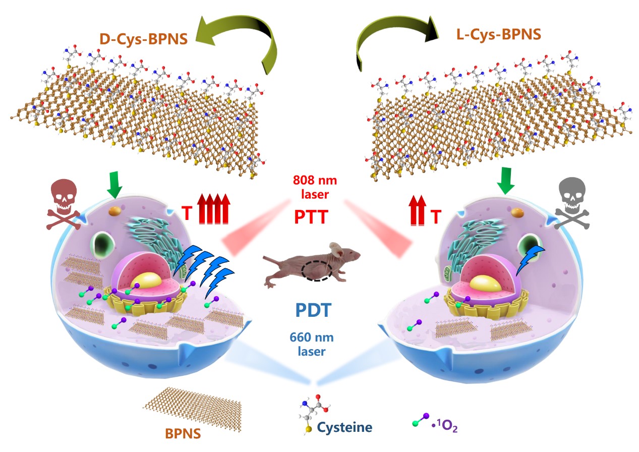 图4 手性氨基酸功能化黑磷对肿瘤进行手性依赖光疗的机制示意图