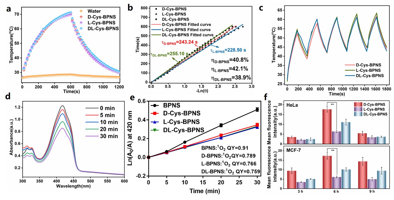 另一方面,为解决BPNS在生理环境中代谢降解迅速、胞内积累量少的问题,我们首次提出了一种基于氨基酸表面功能化的手性BPNS及其用于手性依赖的肿瘤光疗。经不同手性的半胱氨酸(Cys)修饰,获取了相应的D, L, DL-BPNS。经表征,不同手性的BPNS在结构组成、微观形貌尺寸、光敏剂活性与光热性能上基本一致,但在细胞内则显示出手性依赖的抗肿瘤活性,其中D型BPNS的细胞毒性比L型大约高3倍。经生物学电镜与细胞内元素含量的跟踪监测,发现D型BPNS具有更高的胞内累积量以及更慢的降解速率。在对皮下荷瘤小鼠体内应用后,同样展示出与细胞水平近似的手性依赖的肿瘤治疗效应。这极有可能与不同手性BPNS与磷脂膜界面存在手性依赖的识别和相互作用过程有关。该工作首次揭示了BPNS在肿瘤光疗中的手性依赖行为,为光疗纳米剂的开发提供了新途径,也拓展了手性纳米医学的研究思路。(Chen Bo, Li Changming*, Guo Chunxian* et al. Chirality-dependent tumor phototherapy using amino acid-engineered chiral phosphorene. ACS Applied Materials & Interfaces, 2022, accept. 中科院2区,IF 10.38)