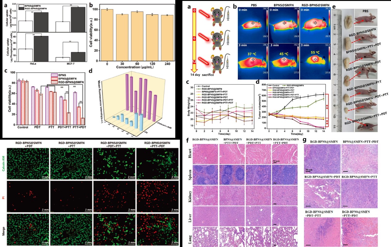 图2 RGD-BPNS@SMFN在细胞与活体水平抗肿瘤效果的评价
