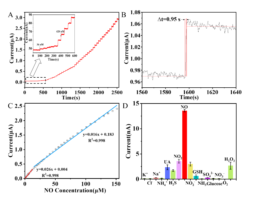利用自组装材料GDY/HEM对NO表现良好的传感性能,达到了0.95 s内的快速响应时间,检测限低至7 nM,宽线性检测范围高达151.38 μΜ。GDY/HEM实现了细胞释放NO分子的快速实时监测。通过实时监测药物刺激下细胞释放的NO分子,实现了GDY/HEM对肿瘤细胞和正常细胞释放一氧化氮的实时监测。通过实时监测细胞释放的NO分子,揭示了其药物浓度和细胞密度的依赖行为。