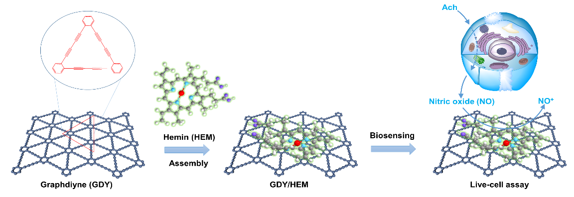 GDY/HEM的设计、制备原理图及其实时监测细胞释放的NO分子
