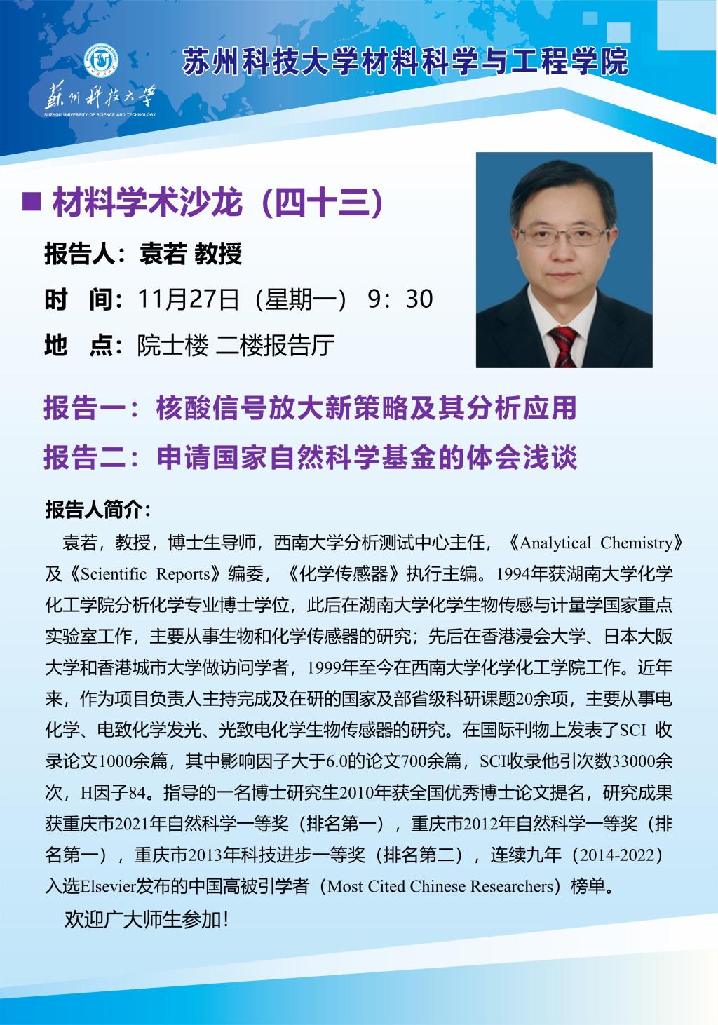 材料学术沙龙四十三:核酸信号放大新策略及其分析应用暨申请国家自然科学基金的体会浅谈