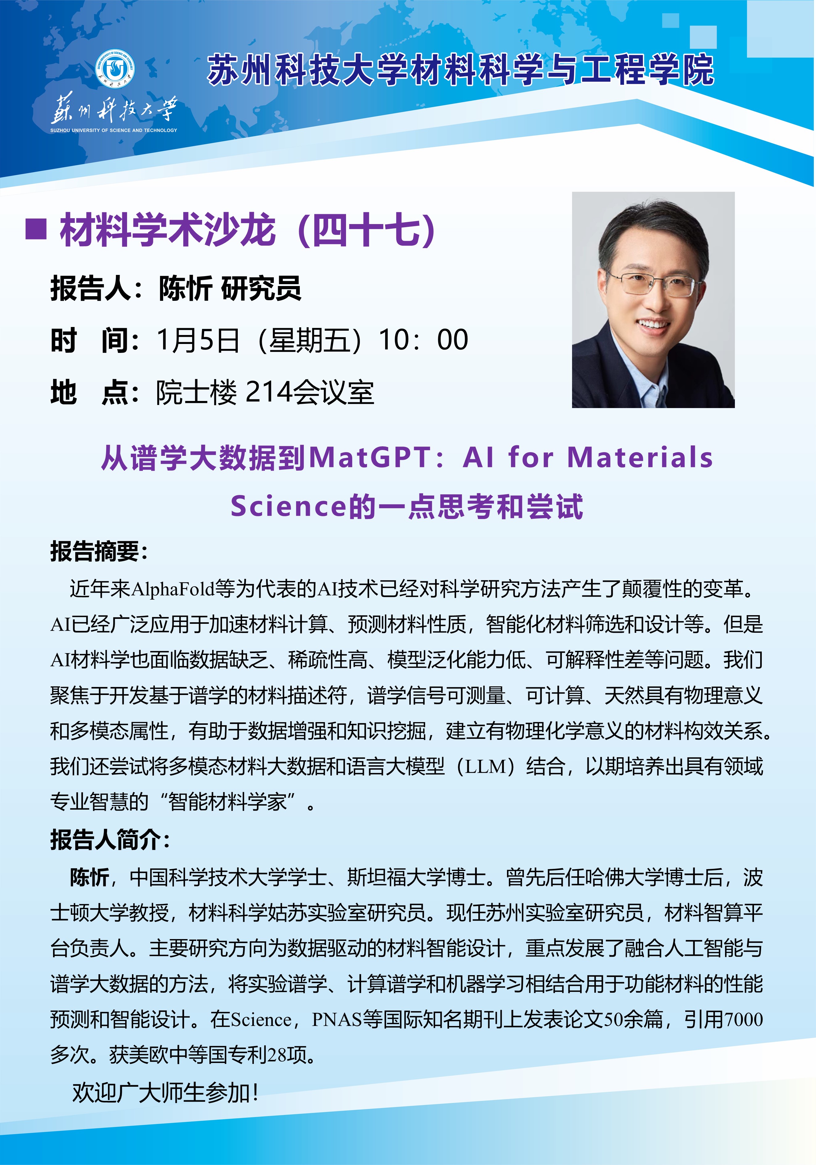 材料学术沙龙四十七:从谱学大数据到MatGPT: AI for Materials Science的一点思考和尝试