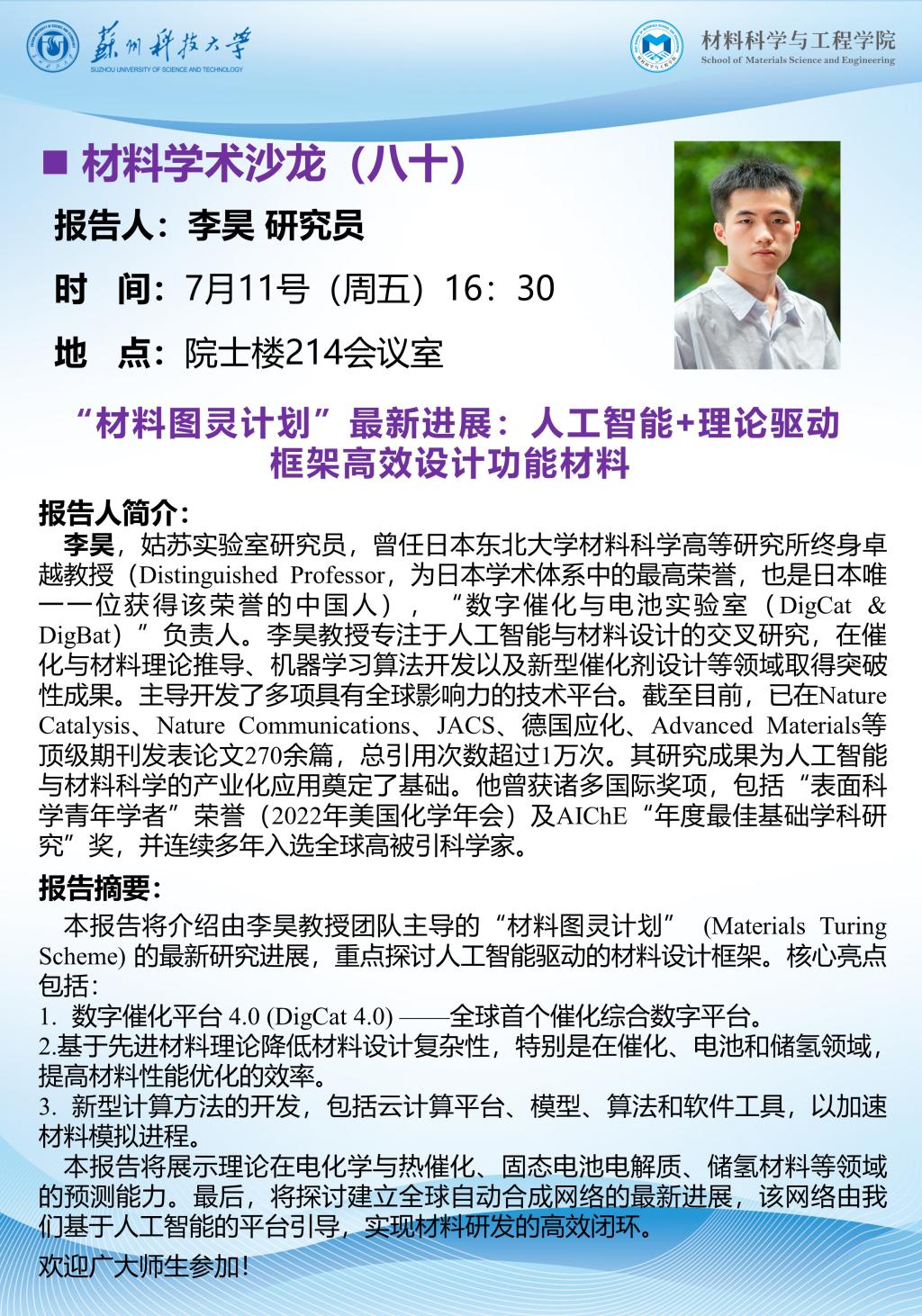 材料学术沙龙八十:“材料图灵计划”最新进展:人工智能+理论驱动框架高效设计功能材料