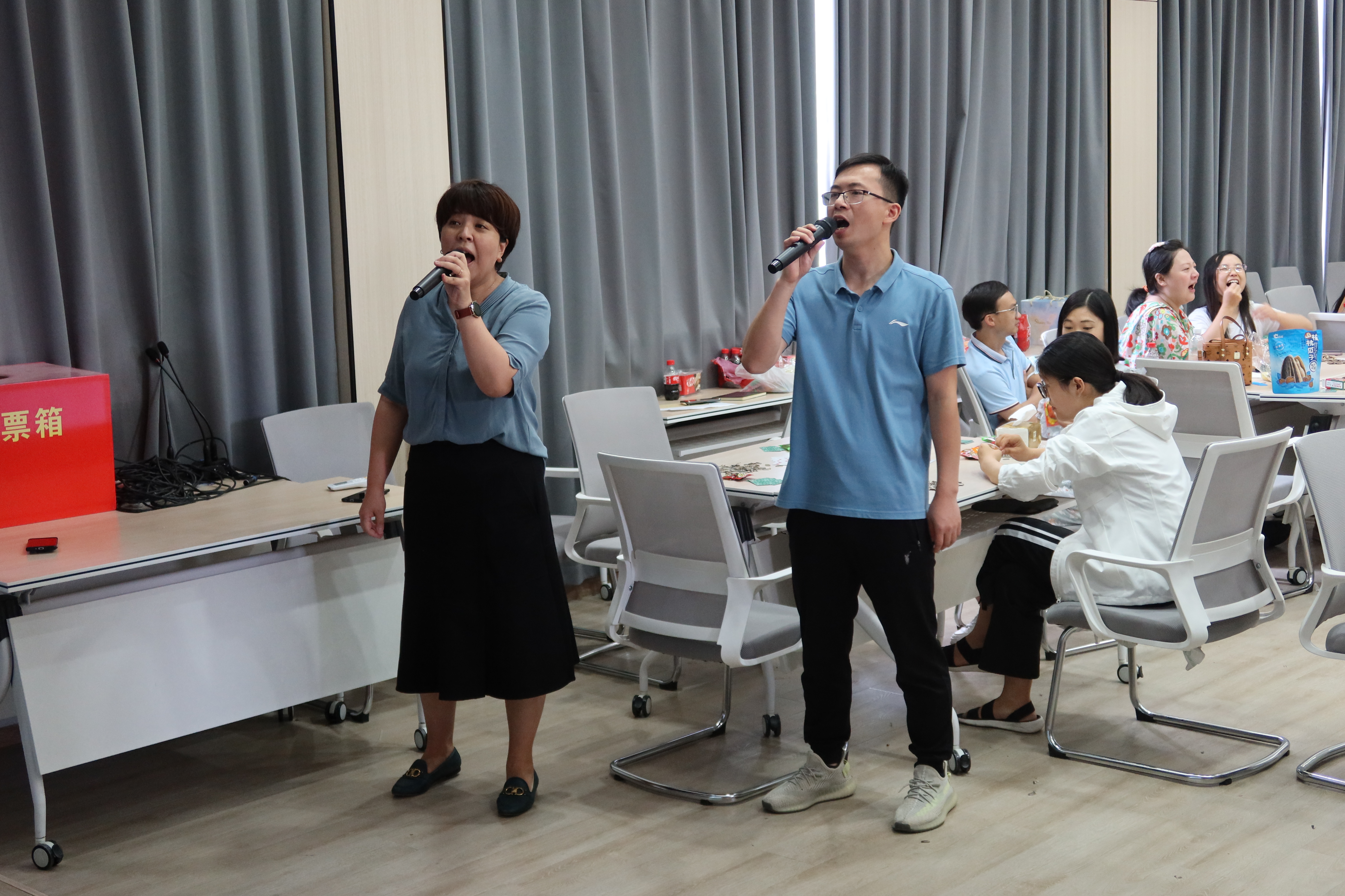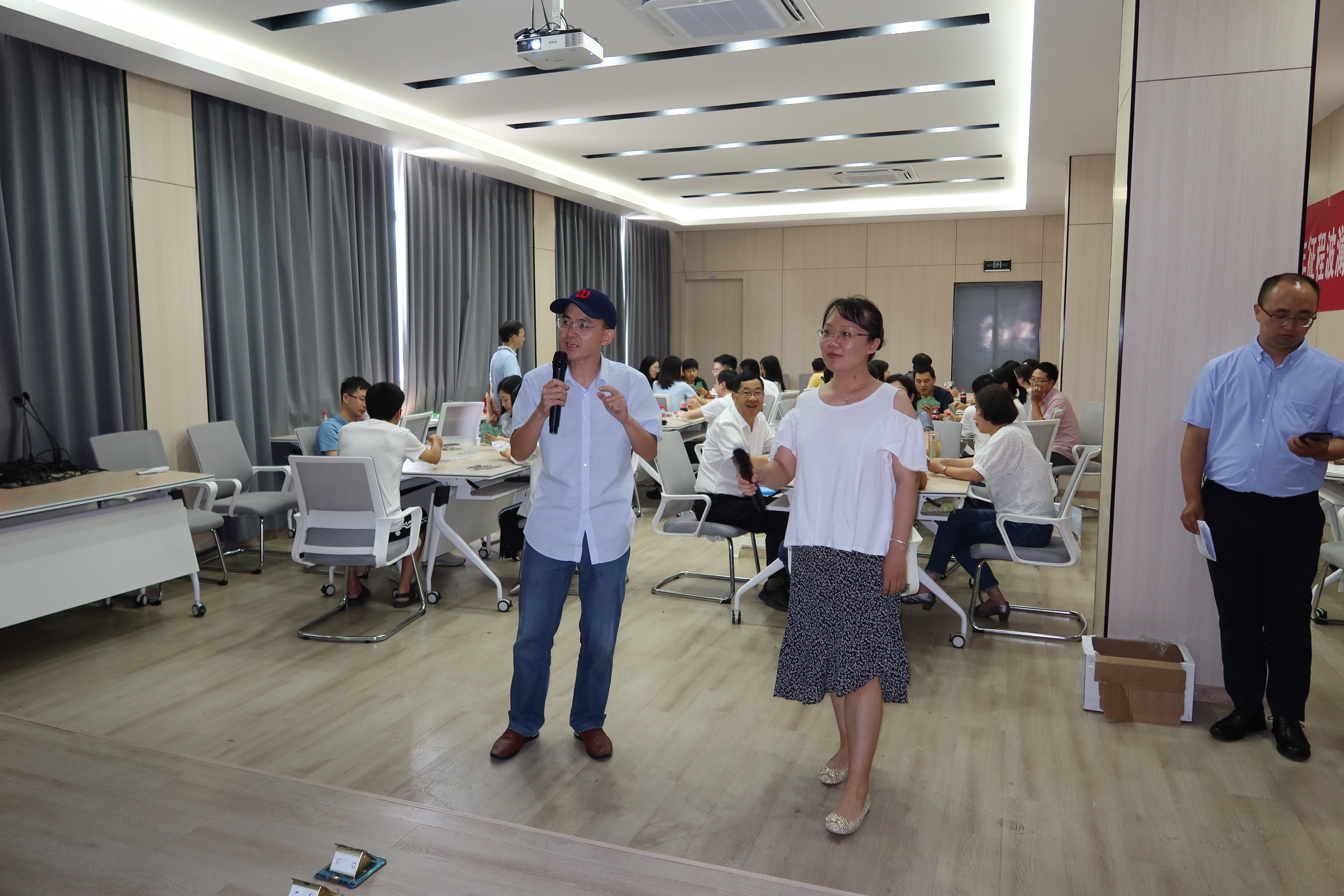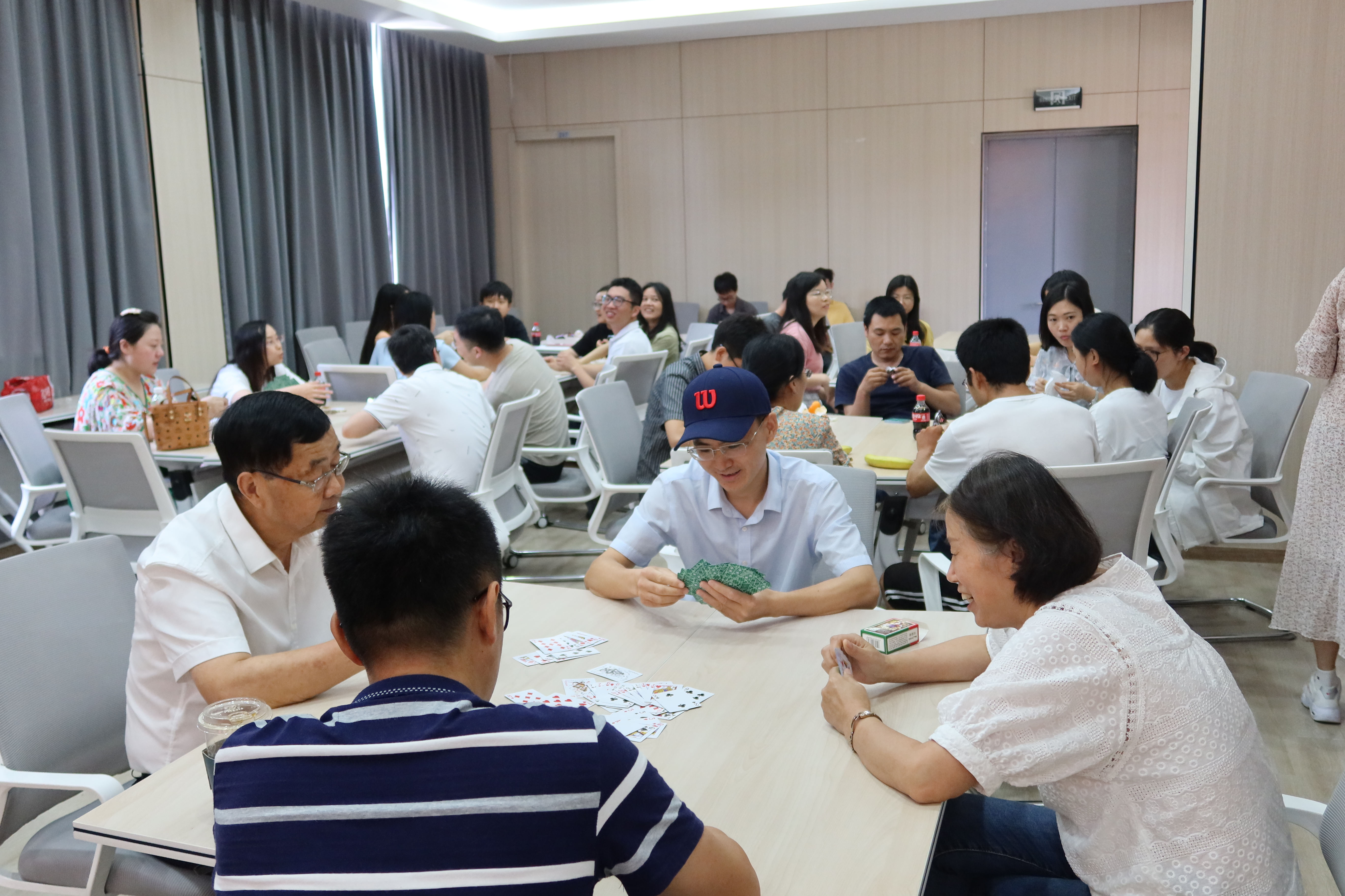 伴着悠扬的音乐,卡拉OK比赛与掼蛋比赛正式开始。台上热情活泼的歌声与台下精彩纷呈的游戏相得益彰,报告厅洋溢着幸福欢乐的气氛。
