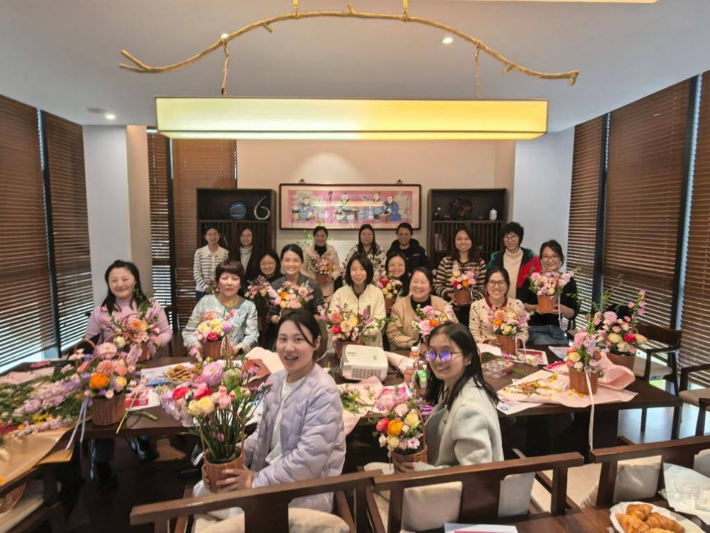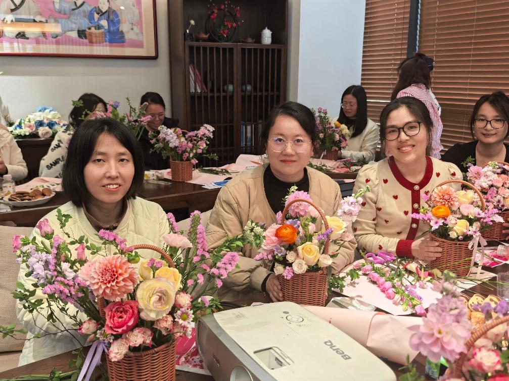 花艺 DIY 体验环节中,女教职工们在花艺老师指导下,精心挑选花材、修剪搭配,将巧思与审美融入春日花篮创作。在动手实践中,大家放松身心、交流互动,在花香中感受自然之美,体验生活乐趣。