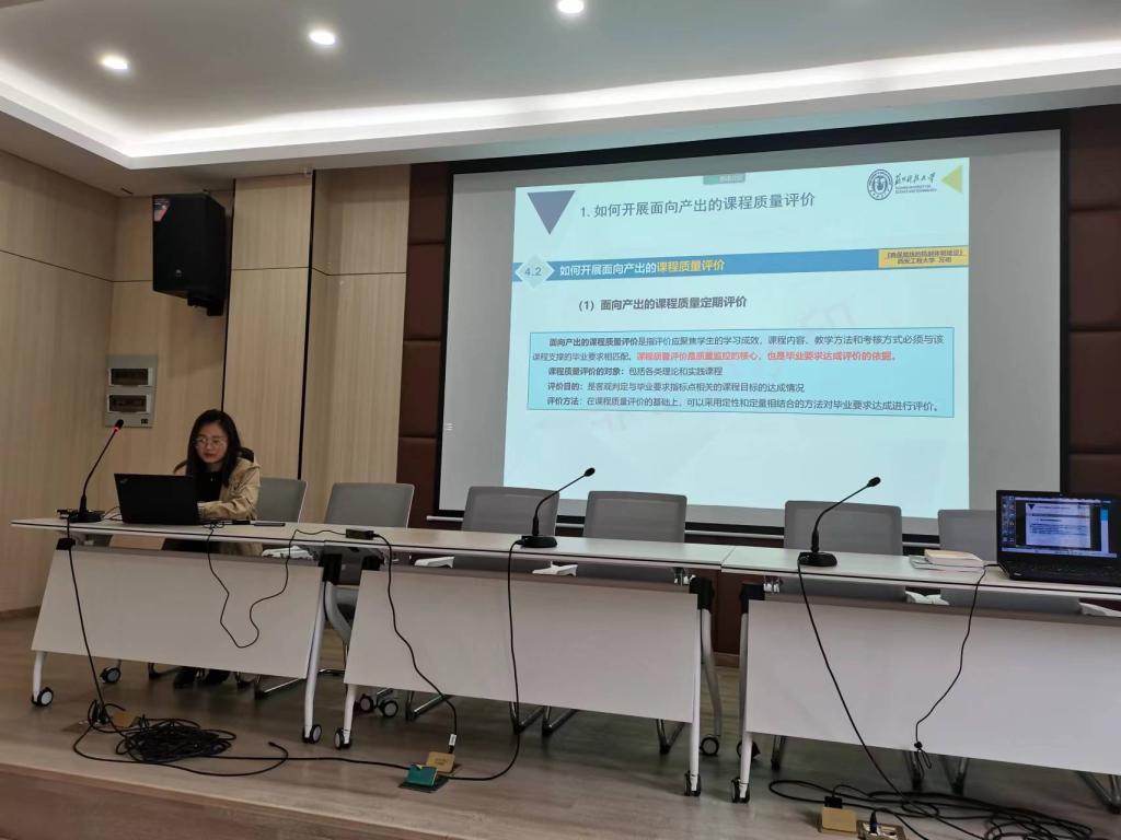 此次培训交流会邀请到学院胡芳馨副教授和陈硕然副教授。胡芳馨副教授从如何开展面向产出的课程质量评价、课程目标达成评价报告常见问题、具体案例解析、培训心得四个方面进行了分享交流。陈硕然副教授针对实践类课程目标达成度分析进行了详细讲解,并进行了现场答疑。会上,系主任和专业负责人还对后续课程群的建设、教研活动开展、教学大纲的修订等工作进行了安排部署。
