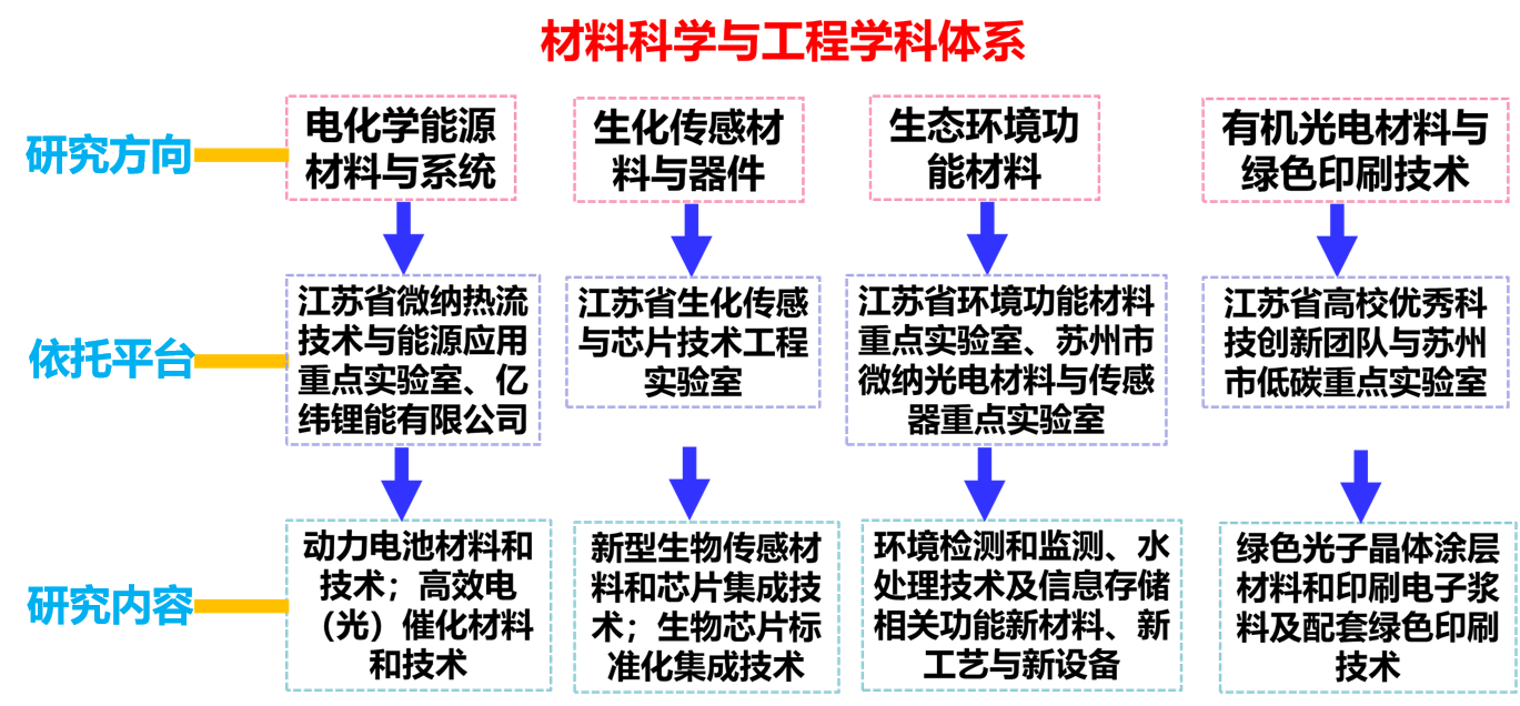 材料科学与工程学科于2011年获批一级学科硕士点授予权,2021年获批省重点学科,同年获批材料与化工专硕。现有新能源材料与器件、功能材料(省一流专业)、材料化学、无机非金属材料四个本科专业。学科先后入选江苏省第一、二、三期优势团队建设项目,2022年入选省“十四五”重点学科,同年9月进入全球ESI前1%。学科围绕国家重大战略,紧盯长三角一体化及江苏、苏州高质量创新发展需求,瞄准材料学科前沿交叉内涵高质量建设,凝练学科特色和优势,打造高水平科研和教学一体化学科团队,创新驱动服务地方经济可持续发展。